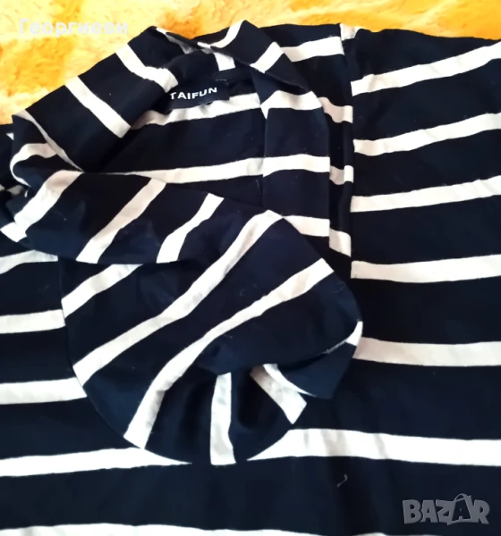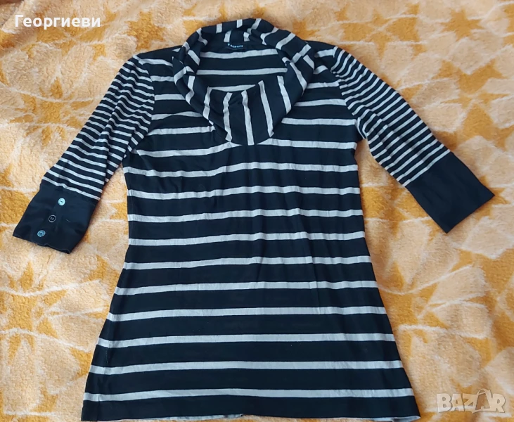 Продавам дамска блуза с интересна яка, с 3/4 ръкави с декоративни копчета, дължината на ръкава, измерена от рамото е 44 см, размери: гръдна обиколка - 104 см, обиколка долу - 116 см, дължина на блузата - 80 см, ширина на гърба горе - от ръкав до ръкав - 42 см. Марка- TAIFUN, висококачествена памучна материя. Цветовете са: черно и тъмноекрю- на хоризонтални ивици, като нова.