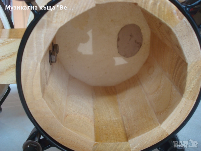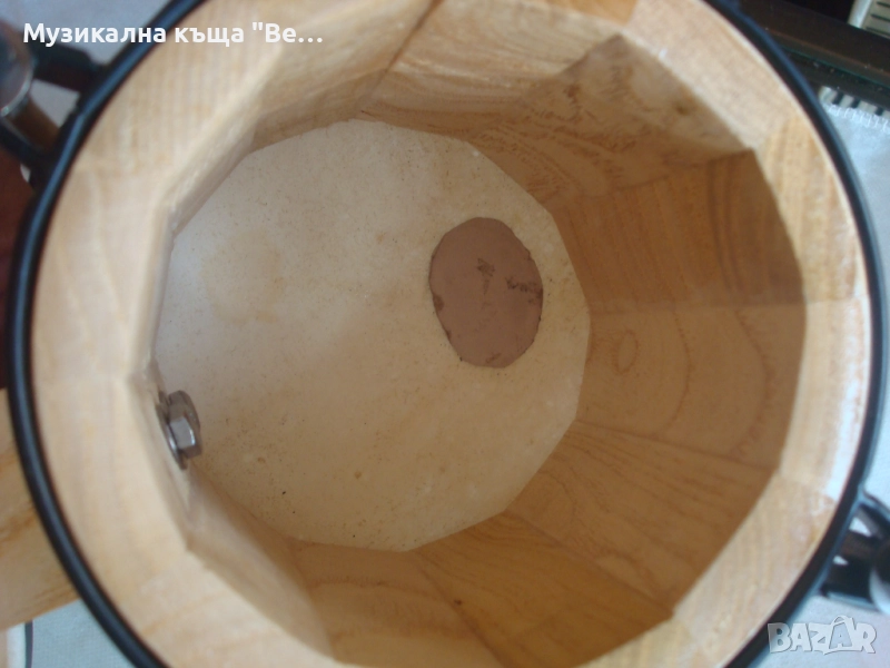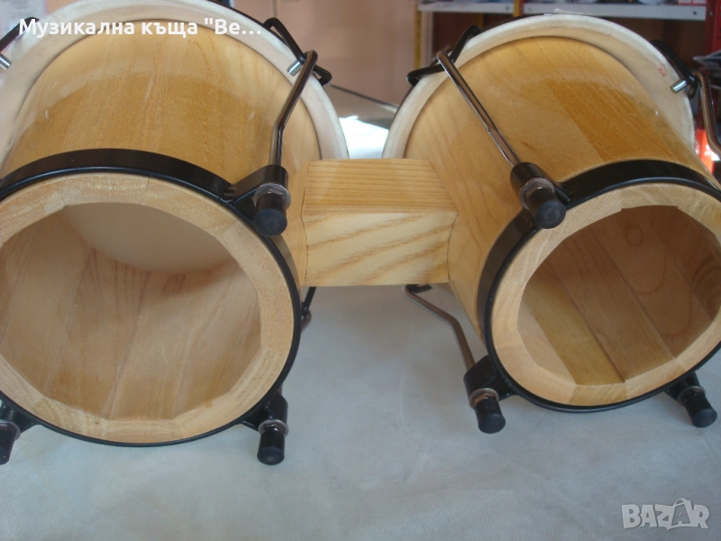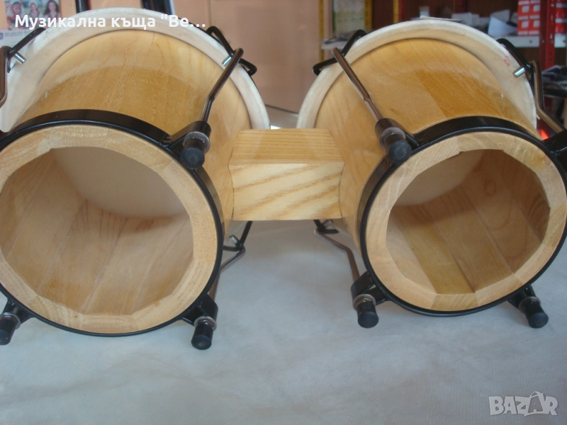 Бонгоси /без стойка/ дървени, внос от Германия. Състояние - като ново. Размер на големия бонгос с обръча - 20,7см. Размер на по-малкия бонгос с обръча - 18,2см. Единствена забележка: едната кожа е била леко закъсана, но е добре залепена - вижда се на снимките /около 1см./, което не влияе на тона. Изпращам по Еконт, Спиди с опция преглед и тест.