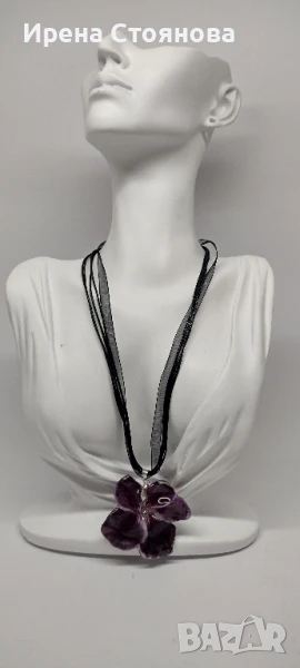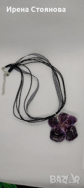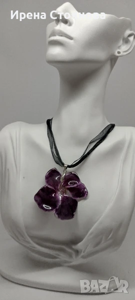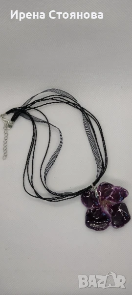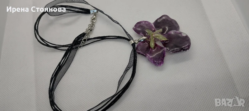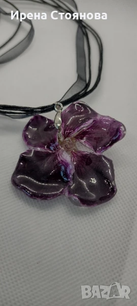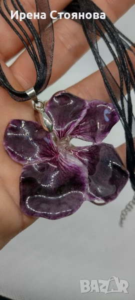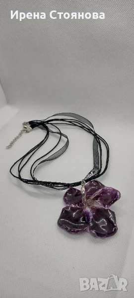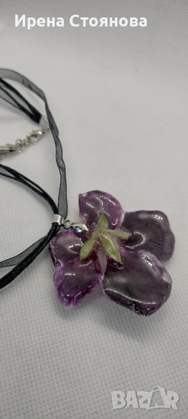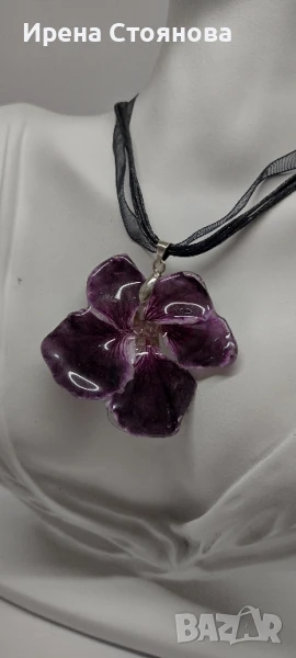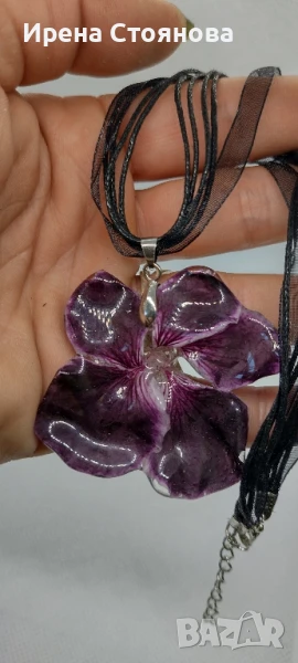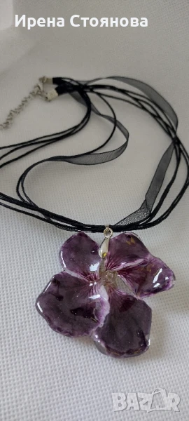 Колие с естествен цвят на Налба. Дължината е максимално 23 см, цвета е с размери 5,5/5 см. Внимателно изсушени и запечатани в няколко слоя епоксидна смола, така че да им се придаде здравина, запазване на формата и цвета. Всяко цвете е различно и неповторимо, което прави колието единствено и уникално. Цена 48 лв.