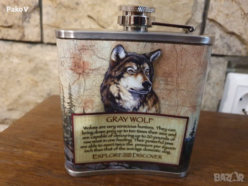 Продавам Стилно шише за алкохол), върху което е отпечатан вдъхновяващ дизайн с вълк сред планинска гора и надпис: