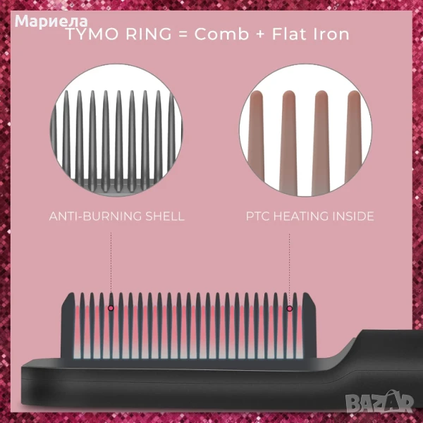 Tymo ринг = преса за изправяне и обем - Tymo рингът е проектиран с термоустойчива защитна обвивка и керамична нагревателна плоча за разплитане, изправяне и дори подобрен обем. Уникален дизайн със златно сечение за изглаждане на косата.