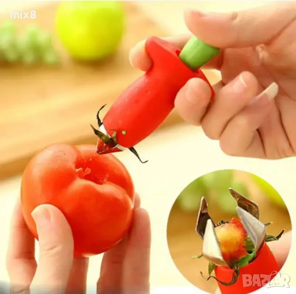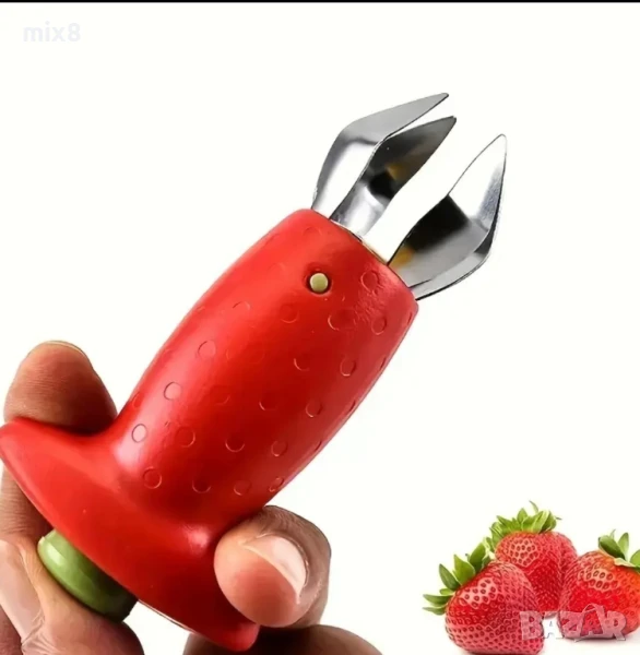 Този инструмент е предназначен за бързо и лесно отстраняване на дръжките и зелените листа на ягодите, без да се губи излишна част от плода.