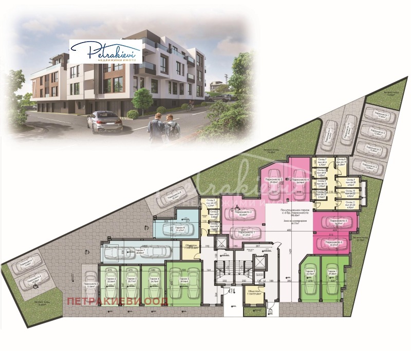 Паркирането е обезпечено с гаражи, открити и закрити паркоместа.