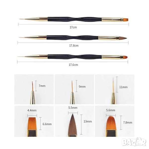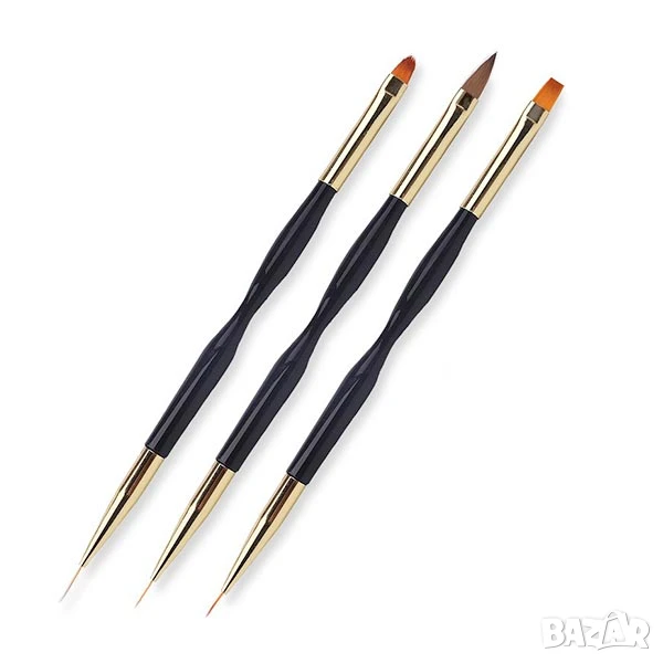 Комплектът с 3 двойни четки за гел, акрил, полигел и декорации са професионално мултифункционално решение за създаване на перфектен маникюр.