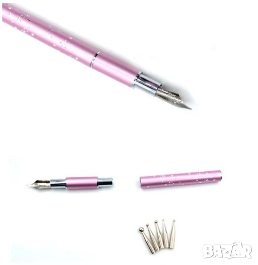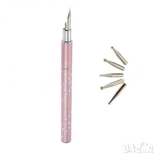 Елегантен и удобен инструмент за рисуване на декорации върху нокти. Стилографът е с 5 накрайника, които могат да се сменят – за рисуване или за рисуване на точки с различни размери.