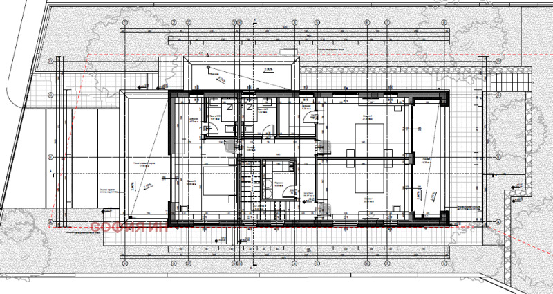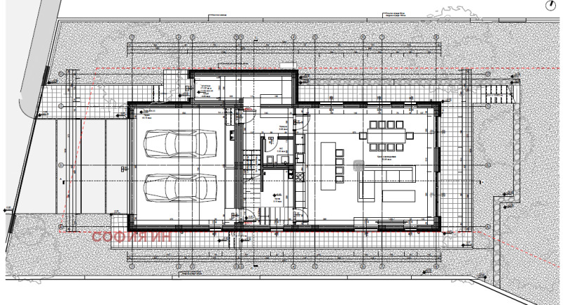 Към нея е проектиран гараж за две коли с топла връзка към основната сграда удобно и практично решение за всяко семейство. Около имота е предвидена обходна пътека от гранитни плочи, а пред гаража циментови плочи с тревна фуга, придаващи стилен и естествен вид.