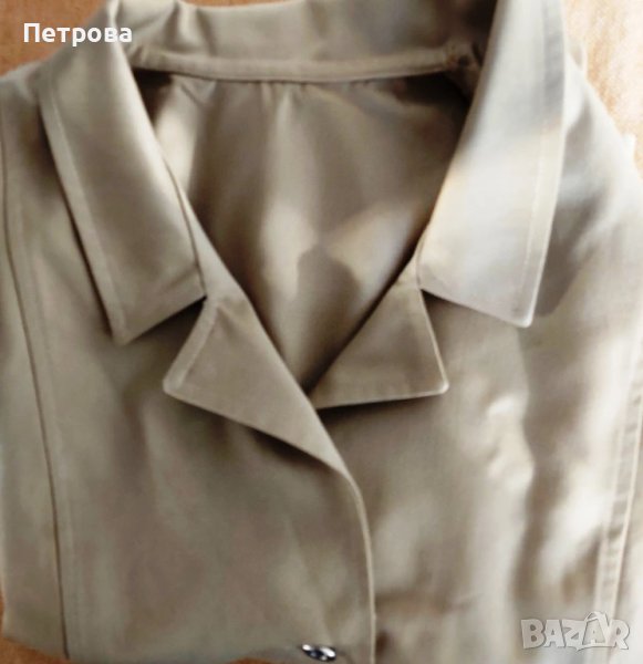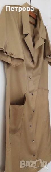 Ежедневна рокля с къс ръкав, нова, от изключително здрав плат, естествена материя, с якичка и ревери, тайор, с декорация на ръкавите, метални копчета отпред, два дълбоки джоба, светло тютюнев, тревен цвят, в раменете 40 см, гр. обиколка 112 см, талия 100 см, ханш 116 см, дължина 100 см, цена 8 евро.Изпраща се с 10% отстъпка от общоприетата куриерска такса.