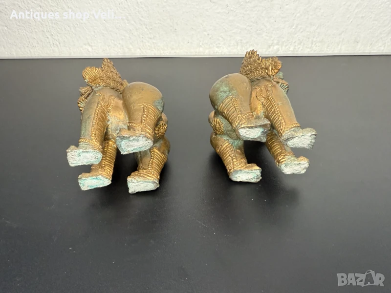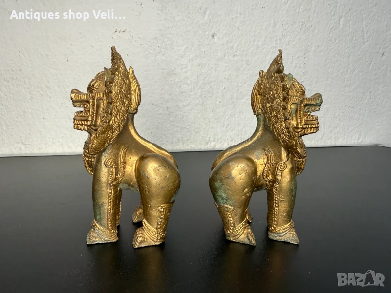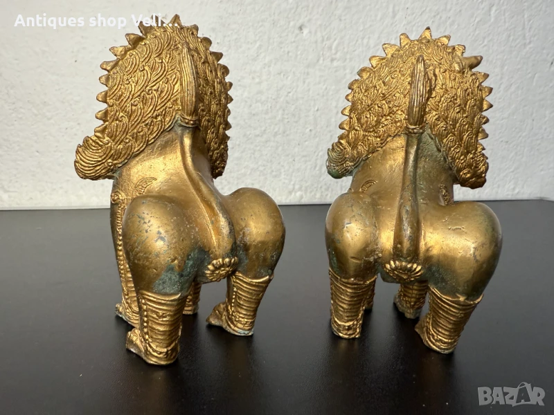 Чифт китайски бронзови фигури, известни като Foo Dogs-мъжки и женски. Ръчна изработка. Произхид: неизвестен, но вероятно Азия. Отлично състояние. Предлагаме доставка с Еконт и лично предаване за градовете Велико Търново, Русе и Сливен. Размери-13/8/6см.