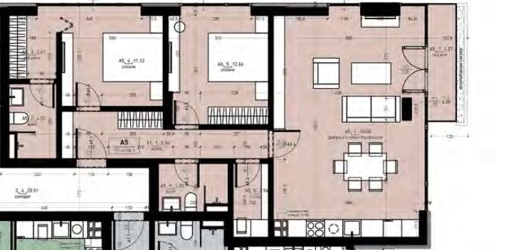 Апартаментът разполага с площ от 113 кв.м./ входно антре, всекидневна с кухненски бокс, две спални помещения, баня с тоалетна , отделна тоалетка, складово помещение и тераса. Разположен на трети етаж. Имотът е подходящ както за лично ползване, така и за инвестиция. Сградата се строи от висококачествени материали, състояща се от шест жилищни етажа, двор и сутерен с мазета и паркоместа.