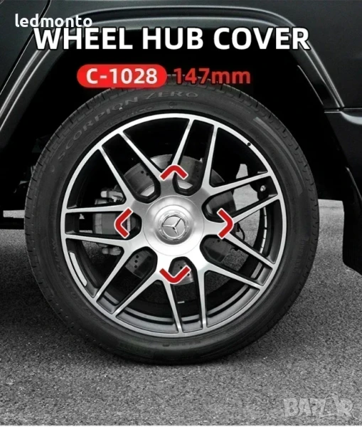 Капачки за джанти с диаметър 147 mm, съвместими с Mercedes-Benz AMG G350, G500, G63, S680, GLS600. Изработени от ABS и алуминий, 100% водоустойчиви, устойчиви на корозия.