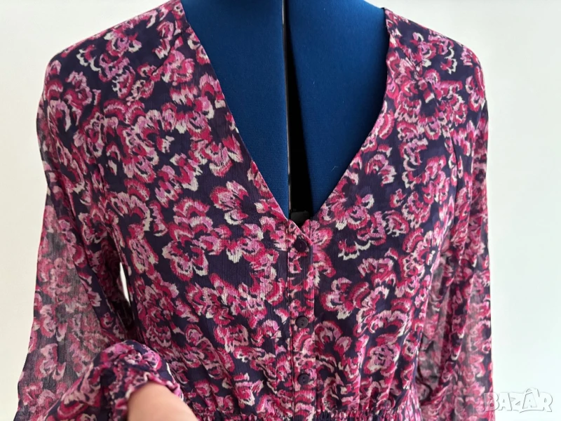 Лека и женствена рокля от марката Cortefiel, изработена от 100% полиестер. Материята е прозрачна и ефирна, с хастар, с изключение на ръкавите. Дълъг ръкав, завършващ с ластик. Роклята се закопчава с копчета по цялата дължина отпред. В талията има ластик, който подчертава силуета. V-образно деколте. Десенът е флорален в розово-лилава гама.