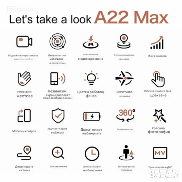 Основна камера: 8K Ultra HD резолюция; Втора камера: Долна, за оптично позициониране; ESC управление на камерата (електронно регулиране на ъгъла); Вграден екран в дистанционното управление; Обхват на управление: до 500 м; FPV видео в реално време; Интелигентни режими: Follow Me, кръгово летене, задържане на височина, връщане с един бутон, Waypoint режим; Мотори: Безчеткови – мощни и тихи; Батерия: Време на полет до 25 минути; Време за зареждане: около 120 минути; Сензори за избягване на препятствия; Гаранция: 12 месеца.
