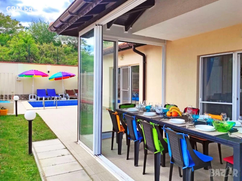 Втората дневна зона, разположена непосредствено до открития басейн, създава идеално място за релакс през летните дни. Просторният двор предлага външни мебели за слънчеви бани или романтични вечери под звездите. Най-малките гости също ще бъдат щастливи – за тях има специално обособен детски кът.