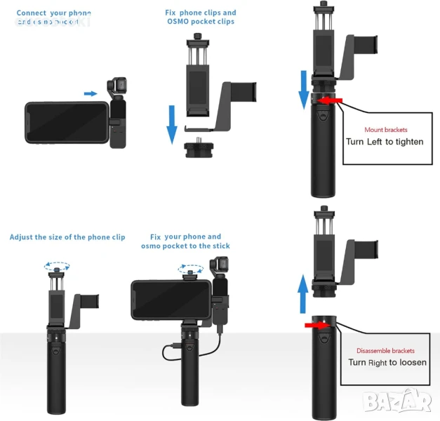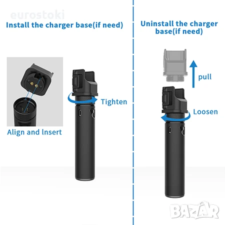 ЗАБЕЛЕЖКА: 2. Ако искате да смените зарядната база с държач за телефон/Osmo Pocket, всичко, което трябва да направите, е да разхлабите зарядната база, като завъртите копчето (вместо да го сваляте) надясно, след което да поставите държача и да го затегнете наляво.