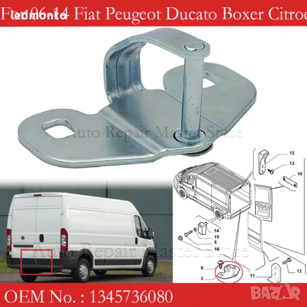 Нов затварящ механизъм за задна врата, подходящ за товарни модели Peugeot Boxer, Citroen Jumper (Relay) и Fiat Ducato, произведени между 2006 и 2014 г. Изработена от здрава метална плочка, в сребрист цвят. Осигурява сигурно заключване на задната врата. Лесен монтаж, директна замяна на оригиналната част.