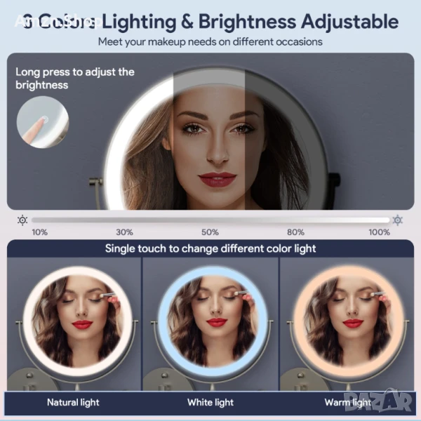 Това огледало за тоалетка предлага бяла, топла и студена светлина. Можете да приложите 3 различни настройки за различни светлинни ефекти: бяла светлина за ежедневен офис или нормален грим, топла светлина за парти или клубен грим, естествена светлина за среща или грим на открито. Лесна промяна на режима на осветление с едно докосване на бутона и продължително натискане, за да регулирате яркостта според вашите нужди.