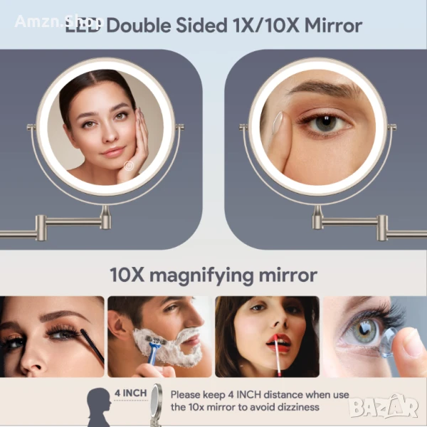 Това подобрено осветено увеличително огледало е с размер 8 инча и е двустранно с 1X/10X увеличение. Висококачествено 1X осветено огледало за цялостен грим на лицето. Можете да го смените с 10X увеличително огледало за красота на гърба, за да покажете детайли на лицето си, когато поставяте очна линия, вежди или червило, идеално е за деликатен грим. Моля, спазвайте разстояние от 4 инча, когато използвате осветеното 10x увеличително огледало, за да избегнете замаяност.