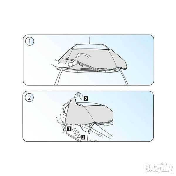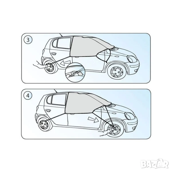 Поставянето на сенника е изключително лесно, просто разгънете сенника, центрирайте покривалото, защипете двата странични джоба със страничните врати на автомобила.