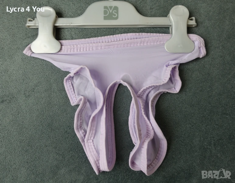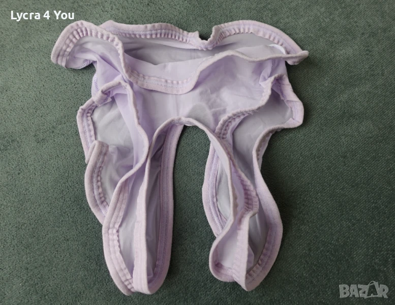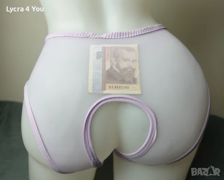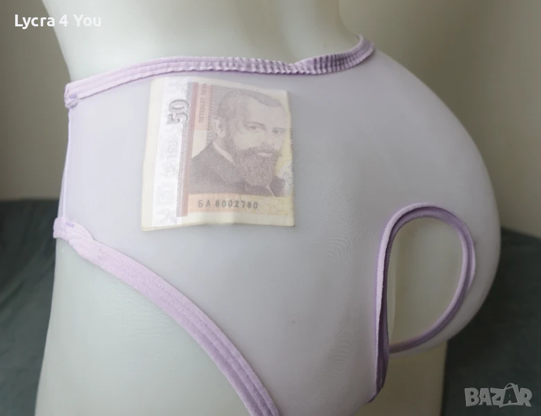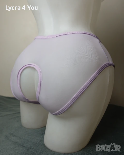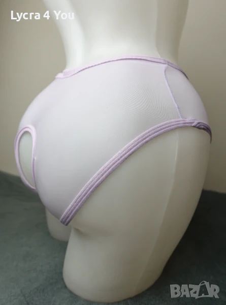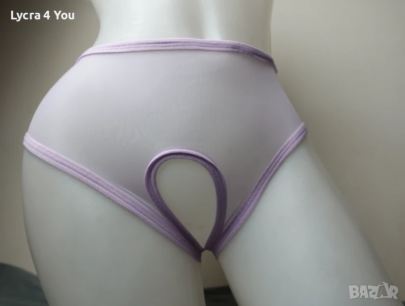 Нови в опаковка, дамски силно прозрачни бикини в светъл лилав цвят и фабричен интимен отвор. Материята е много фина като на чорапогащник 20 ден и съдържа ликра (разтяга се доста, за да стои както е показано на манекена). По периферията и отвора на дъното има зашит ластичен кант.