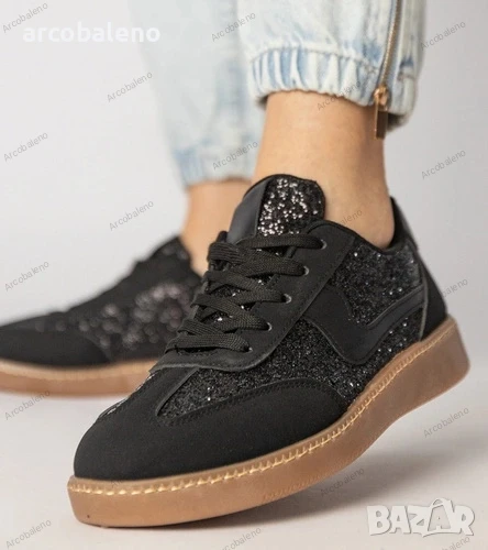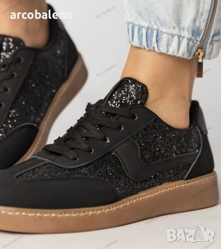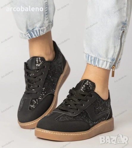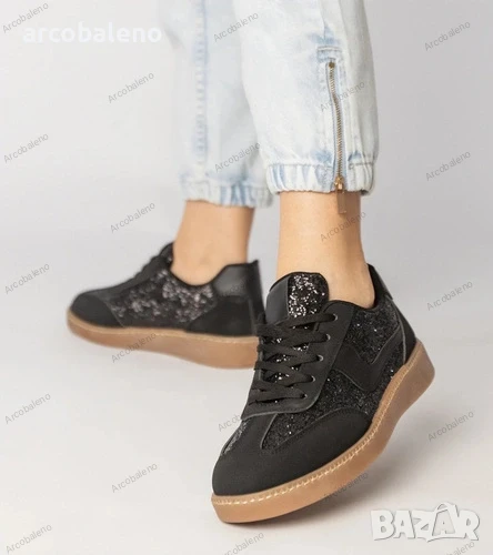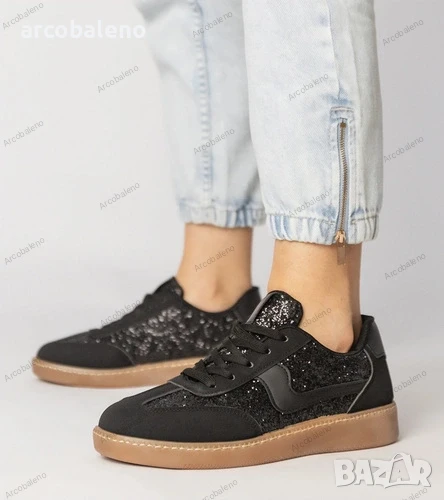 Изработени от най-висококачествени материали, тези маратонки, украсени с брокат, са перфектен избор както за ежедневно носене, така и за специални поводи. Универсалният им черен цвят ги прави лесни за съчетаване с разнообразни тоалети, от ежедневни до по-елегантни. Блестящите украшения им придават уникален и привличащ вниманието характер, гарантирайки, че винаги ще бъдете център на вниманието.