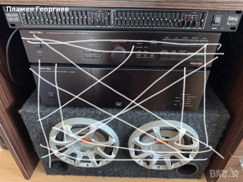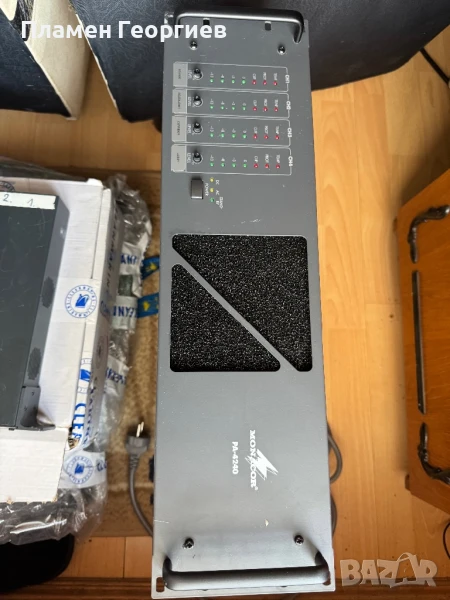 Крайно стъпало Мonacor PA-4240, Monacor PA-1414MX е пред усилвателя и Еквилайзер: Stige line MEQ-115 Обща цена 400 евро. Може и по отделно. Договаряне