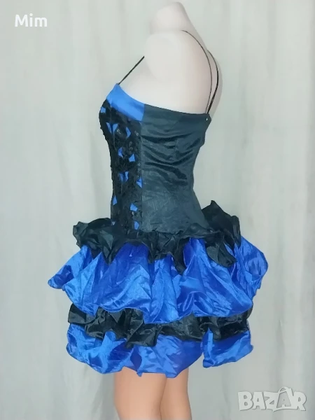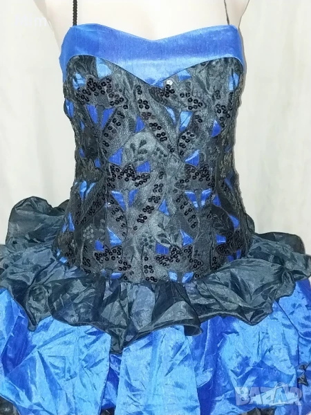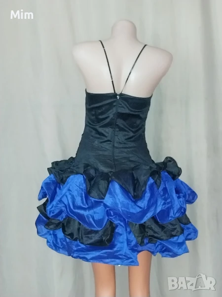 Официална къса рокля в черно и синьо полата е на 4 волана / къдри /започващи от ханша ,отпред с релефна бродерия с черни пайети с 4 отвесни банели.гръдна 80 см.талия 70 см ханш 88 см ,дължина 90 см Няма забележки.