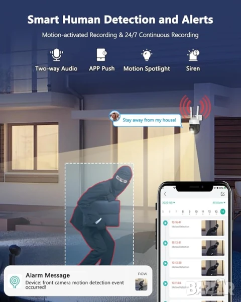 С чувствителен PIR сензор за движение, тази външна охранителна камера може бързо и точно да открива хора, като анализира формата и лицето, намалявайки 99% от фалшивите аларми.