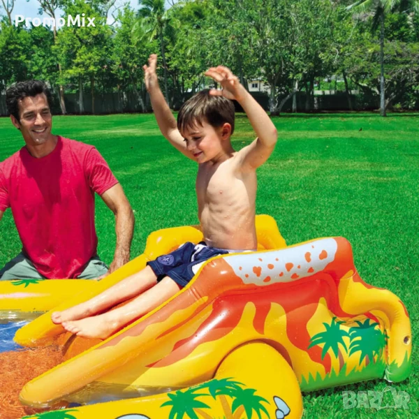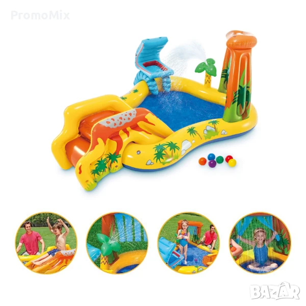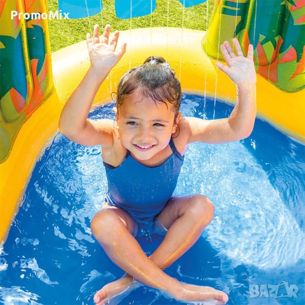 Intex Dinosaur Play Center е детски надуваем воден център 4в1, който комбинира басейн с мини водна пързалка, нежен водопад , пръскаща палма и мини баскетболен кош с включени 6 броя цветни топки.