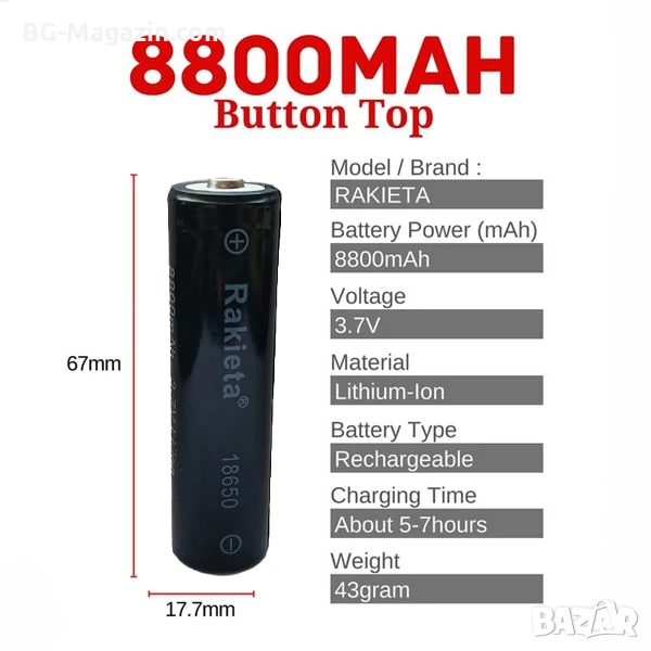 Акумулаторна батерия 18650 Li-ion 3.7V Rakieta 8800mAh е добър избор за тези, които търсят цветни и презареждаеми батерии за своите устройства. Въпреки това, е важно да се има предвид възможността за нереален капацитет и да се подходи с внимание към заявените 8800 mAh.