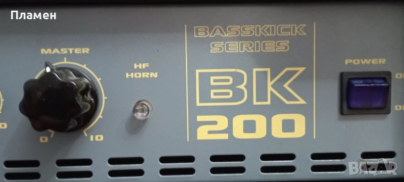 Продавам Немски китарен усилвател Hughes & Kettner BassKick BK200. Усилвателя е с изходяща мощност от 200 вата RMS, които се подават на мощен 15 инчов говорител и HF рупор. Кубето е много голямо като обем и тежи 32 килограма. Два входни жака за свързване на пасивна и активна бас китара. Копчето Gain служи, разбира се, за регулиране на нивото на входния сигнал. Предусилвателят на това устройство използва така наречената Tube-Touch-Circuit технология, патентована от Hughes&Kettner. Според производителя, тази схема на предусилвателя е много устойчива на изкривявания, дори при високи нива на входния сигнал. Punch е бутон, който превключва филтър, който симулира честотната характеристика на класически