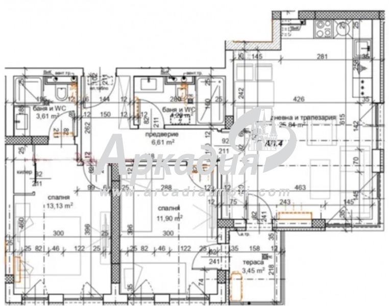 Апартаментът е с обща площ от 145 кв.м (с включени общи части), като чистата жилищна площ е 98 кв.м. Състои се от Г-образен коридор, просторна всекидневна, две спални, две бани с тоалетни, малък балкон към дневната и голяма тераса с площ от 47 кв.м. Терасата обхваща двете спални и е закупена допълнително, вписана в нотариалния акт с право на ползване единствено от собственика на апартамента. Изложението е югоизточно, което гарантира отлична осветеност през целия ден.