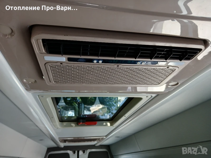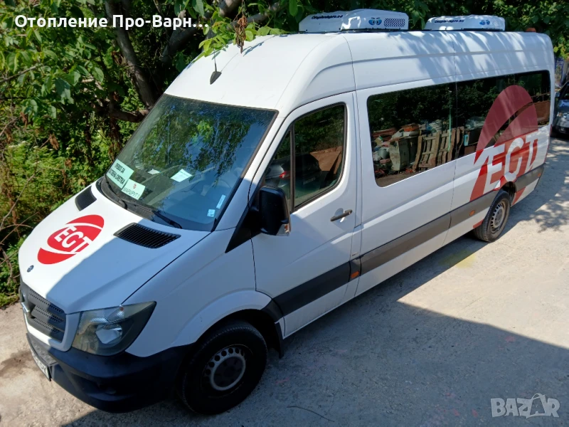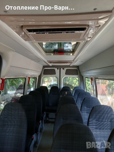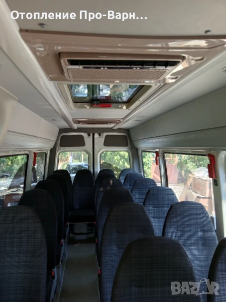 Гарантирана климатизация на пътнически 19 местен бус Mercedes-Benz Sprinter 319CDI с брандова климатизация “Sprinter 7000+” DC12V/24V PRO-Sprinter7000W до 24 градуса само за 20 минути. Постига се гарантирана климатизация от външни температури 38-40 градуса до 24 градуса (може да се регулира 18-30 градуса) в рамките на 20 минути и до 21 градуса в размките на 30 минути. Постигната климатизация конкурира напълно фабрична заводска климатизация реализирана с механичен климатичен компресор задвижван от двигателя благодарение на високата инсталирана охлаждаща мощност 7000W и реализация на затворена двукругова система на вътрешна циркулация на въздуха. Реализирана климатизация е решение без аналог в България за до 19+1 места бусове Форд Транзит, Mercedes-Benz Sprinter и други модели бусове от Otopleniepro.eu.