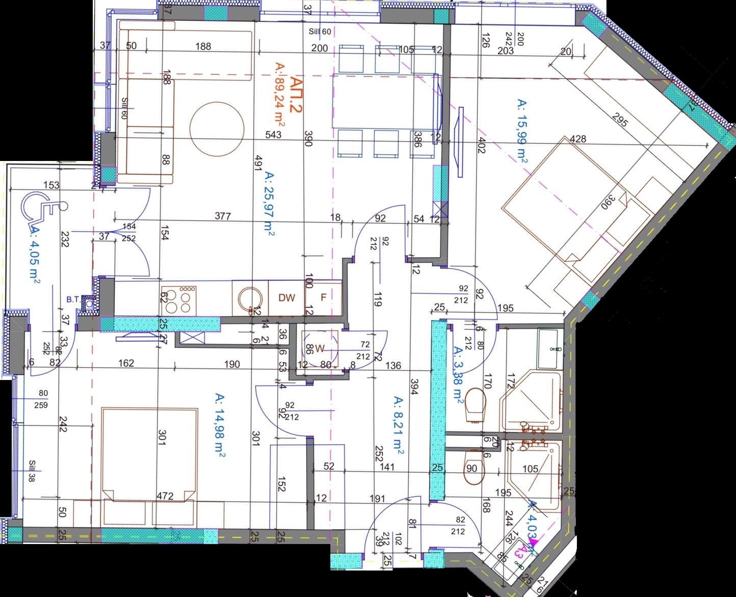 Имотът е ситуиран на 1-ви жилищен етаж с площ от 104.29 кв.м. и има следното практично разпределение: хол с бокс кухня, две спални, две бани с тоалетна, тераса.