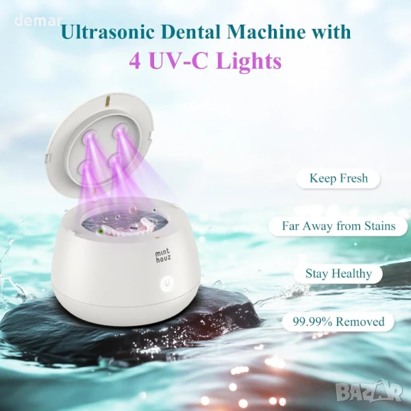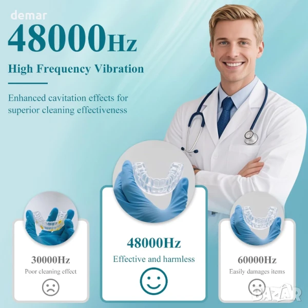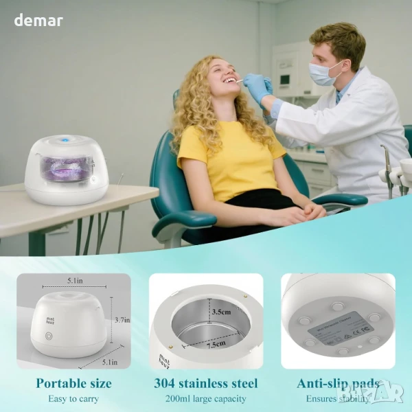 Тази компактна ултразвукова почистваща машина осигурява дълбоко 360° почистване с 48kHz вълни, насочени към всяка пукнатина на ретейнери, протези, алайнери и протектори за уста. Тя разполага с четири вградени UV лампи, които стерилизират и елиминират до 99,9% от бактериите, предлагайки хигиенични резултати при всяка употреба. Освен зъбни артикули, тя е подходяща и за почистване на бижута, самобръсначки и глави на четки за зъби. С тиха работа под 45dB и издръжлив резервоар от неръждаема стомана с обем 200 мл, тя е идеална за дома или пътуването. Комплектът „всичко в едно“ включва аксесоари и лесен 5-минутен автоматичен цикъл на почистване с един бутон.