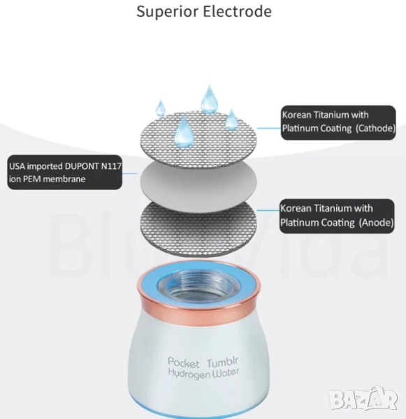 * Двукамерна технология Real SPE (твърд полимерен електролит) + PEM (протонна обменна мембрана), корейски титан с платинено покритие.