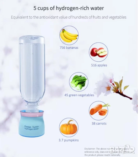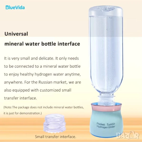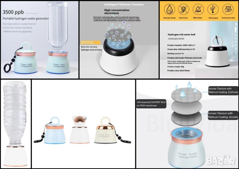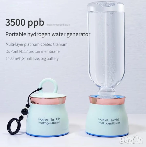 Това е просто преносим водороден генератор за вода, не съдържа бутилки, така че е много малък, подходящ за пътуване и носене. Може да се адаптира към повечето бутилки за минерална вода на пазара. Разбира се, ние сме го оборудвали и с по-малък адаптер за по-широка гама от приложения.