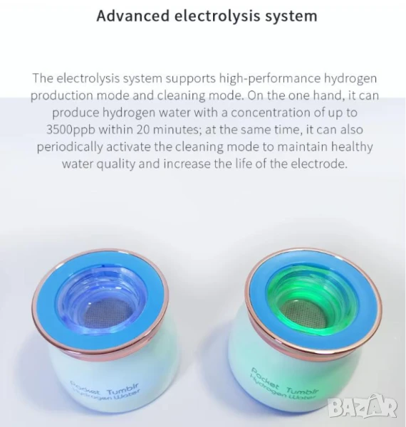 * 100% безопасен за пиене, чистотата на водорода достига 99,99%. Кислородът, хлорът и озонът се отделят и се изпускат от долното устройство за отвеждане на отпадните газове.