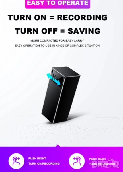 ЗАПИС НА АУДИО С ЕДИН БУТОН ПЛЪЗГАЧ: Просто плъзнете бутона за включване/изключване, за да започнете/запишете лесно записа.