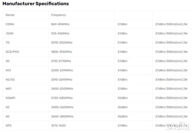 Може да блокира всички основни 2G, 3G, 4G, 5G, GPS, Wi-Fi мрежови ленти.