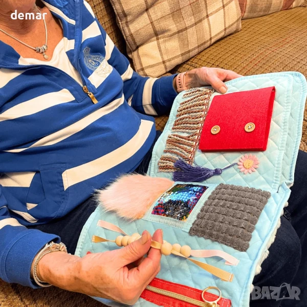 Тази мека, тактилна книжка е проектирана да ангажира ръцете с ципове, мъниста, пайети, катарами и текстуриран гръб с цвят на минко, което я прави идеална за хора с тревожност, деменция, аутизъм, ADHD или Алцхаймер. Тя включва персонализирана фотосесия и помага за подобряване на фината моторика и координацията. Изработена от издръжливи материали с удобна велкро лента за преносимост, тя е грижливо и дълготрайно помагало от надеждна британска марка, подкрепяща самостоятелния живот от 1984 г.