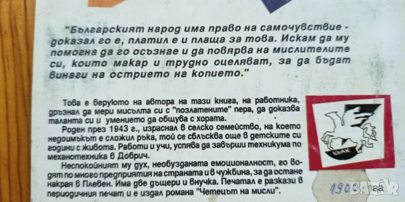 Анотация от автора: "И силните духом хора падат, но не коленичат. Изправят ли се, отново следват посоката си. Такива са и някои от героите в тази книга, която е продължение на романа "Четецът на мисли". Дъщерята изнасилена по брутален начин, майката се отказва от правосъдието, става любовница на насилника и сама произнася присъдата. Неуспял бизнесмен излиза от затвора, не заобикаля сблъсъка с една прокурорка, а мъжът в него не претава да следва жената, която цял живот е искал. Афери с "Марлборо", бизнес, удари под пояса и много любов. Това е само част от онова, с което предстои да се срещнете по страницата на романа."