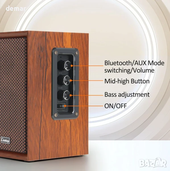 високоговорители предлага персонализируем звук с отделни контроли за бас, средни и високи честоти, осигурявайки персонализирано слушателско изживяване за всеки музикален стил. Свързва се лесно чрез USB, RCA или Bluetooth, като поддържа и AUX вход за съвместимост с различни устройства. Настройката е бърза и лесна, предлагайки висококачествен звук в широк честотен диапазон с мощно, без изкривявания аудио. Стилното дървесно покритие добавя декоративен щрих към всяко пространство, а интуитивният дизайн и вградената система за обратна връзка правят работата безпроблемна за потребители от всички възрасти.