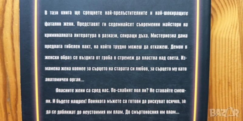 В тази книга ще срещнете най-прелъстителните и най-шокиращите фатални жени. Представят ги седемнайсет съвременни майстори на криминалната литература в разкази, спиращи дъха. Мистериозна дама предлага гибелен пакт, на който трудно можеш да откажеш. Демон в женски образ се въздига от гроба в стремеж да властва над света. Измамена жена копнее за сърцето на старата си любов, за сърцето му като анатомичен орган…