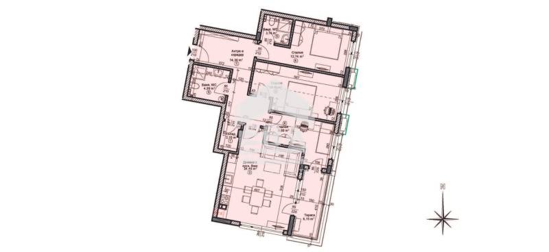 Застроена площ 106,02кв.м (118,00кв.м с общите части), разположен на четвърти от 6 етажа. Имотът включва просторна дневна с кухненски бокс и трапезария (24,40 кв.м.) с излаз на балкон (6,15 кв.м.), спалня (15.16 кв.м.), втора спалня (9,50кв.м), трета спалня (12,74кв.м), баня с тоалетна (3,14 кв.м.), склад (2,15кв.м.), втора баня с тоалетна (4,99кв.м), Изложение: Югоизток