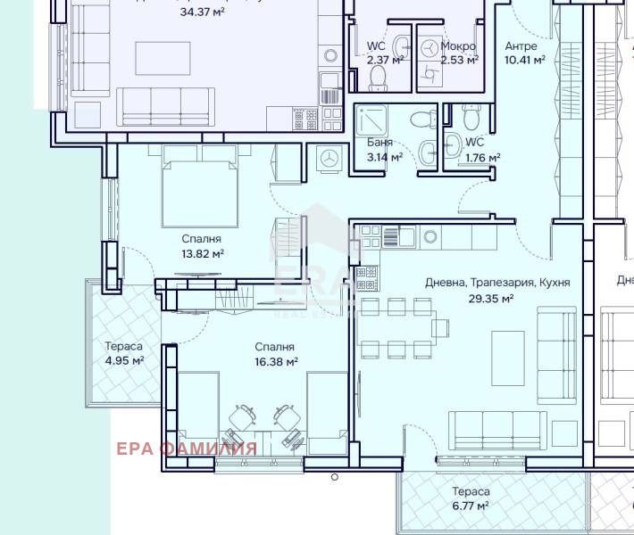 Апартаментът се намира на втори етаж с чиста застроена площ от 105,84 кв.м и е със следното разпределение: дневна с трапезария и кухненски бокс, две спални, входно антре, склад, баня с WC, отделно WC и две тераси.