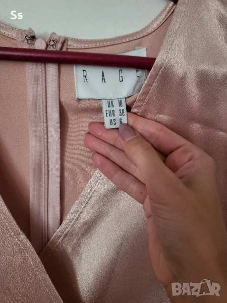 Роклята е в нежен розов цвят. Елегантна, подходяща за официални поводи. Не е еластична., не е носена, закупена е от Англия. Отговоря на размер