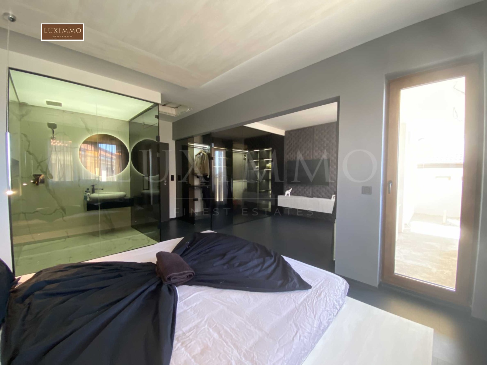 Спалня със собствени, остъклена баня, дрешник, тераса.