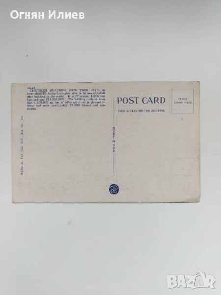 Стара пощенска картичка на Chrysler Building, Ню Йорк, 1940г., снимка 1 - Филателия - 51108051 Стара пощенска картичка на Chrysler Building, Ню Йорк, 1940г., снимка 2 - Филателия - 51108051 1/2