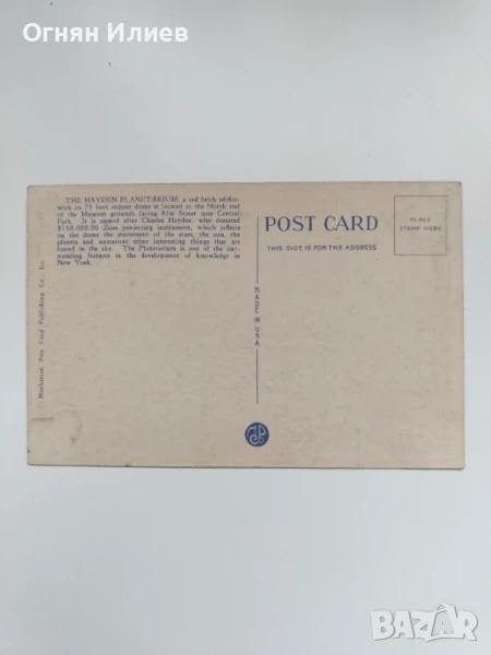 Стара пощенска картичка от 1937г., изобразяваща ,,Hayden Planetarium" в Ню Йорк, САЩ.