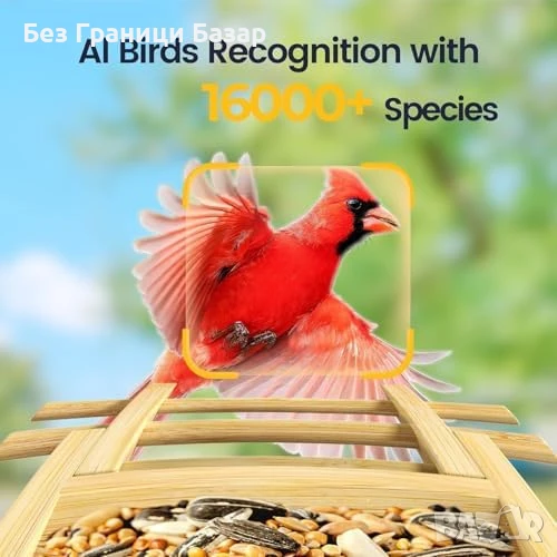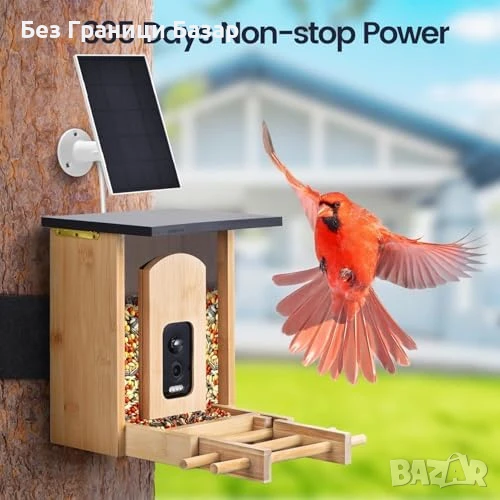 Нова Смарт хранилка за птици с камера, бамбук, AI, 2K, соларна, слънчева
